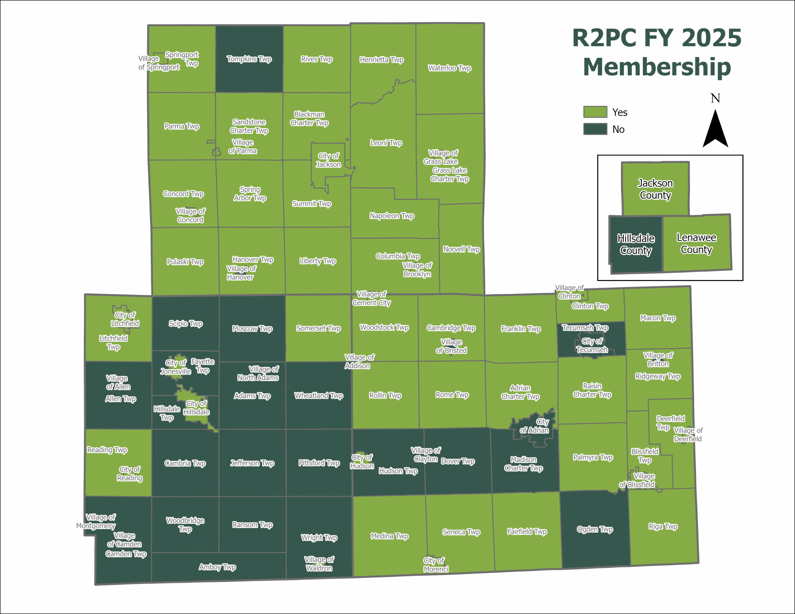 The R2PC is comprised of interested local units of governments (including counties) in the counties of Hillsdale, Jackson, and Lenawee who get together to discuss issues of regional interest and to avail themselves of the professional expertise of its staff on land use and other related issues.